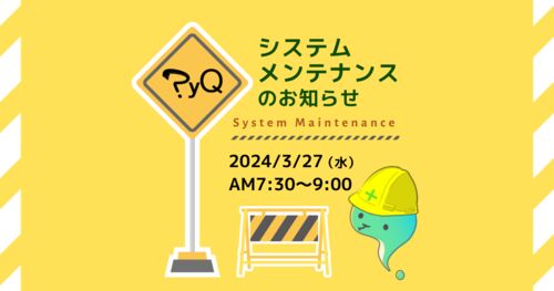 2024年3月27日に実施するメンテナンスのお知らせです。午前7:30〜午前9:00の時間帯で、PyQのすべてのシステムがご利用いただけません。
