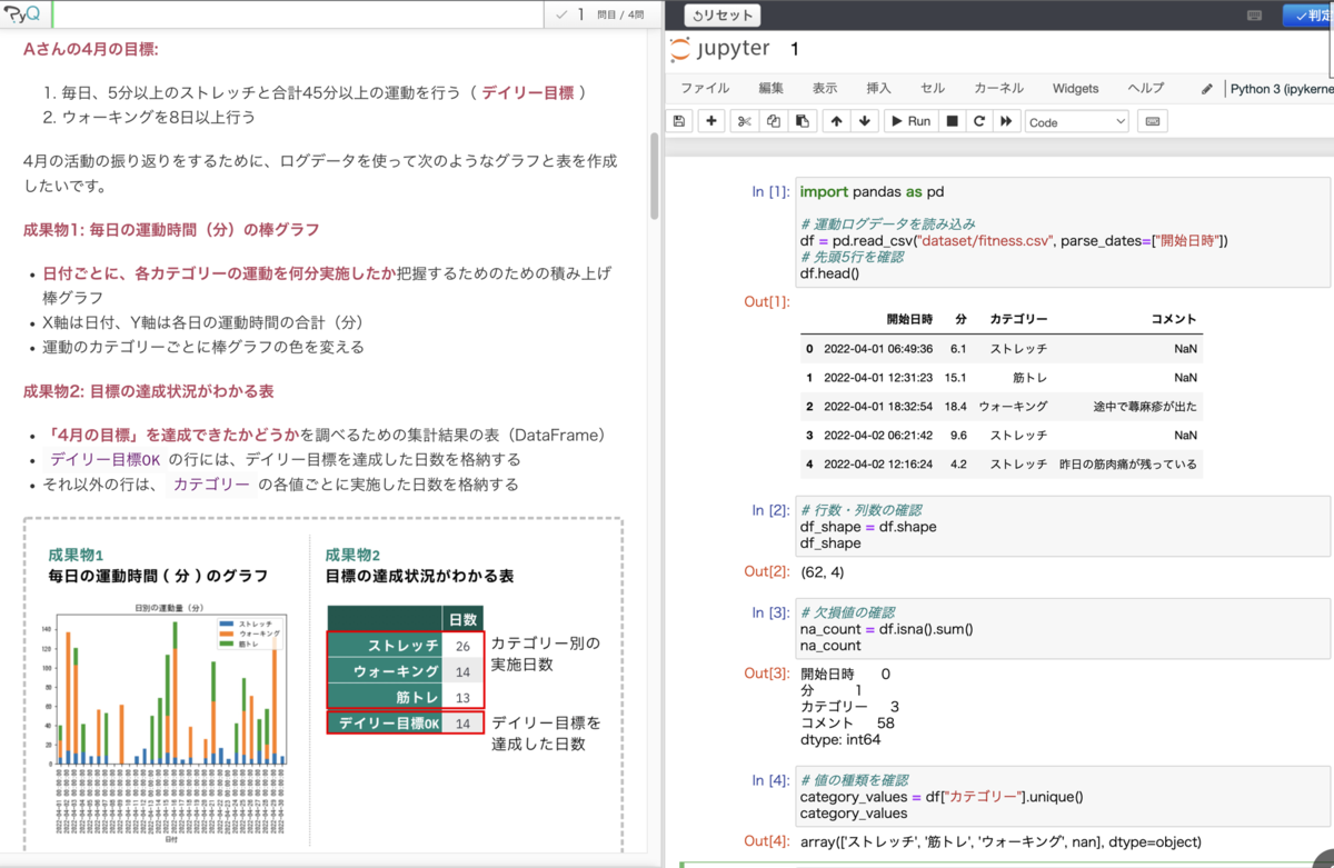 そのため今回のリリースでは、簡単なデータ処理のプロセスを通してpandasの機能を復習できる課題を用意しました。今回の総合演習は、特に以下の点に留意して作成しています。