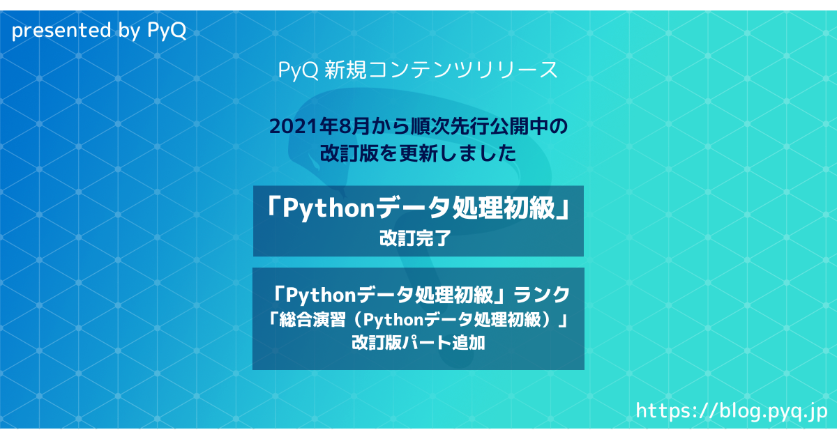 今回のリリースをもって、2021年8月から改訂を進めてきた 「Pythonデータ処理初級 改訂版」ランクの全パートの作成が完了 しました。