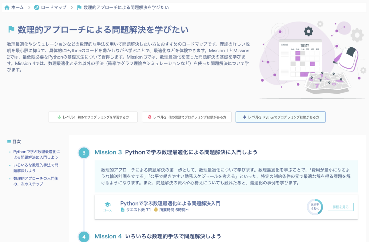 Mission 3「Pythonで学ぶ数理最適化による問題解決入門」 では、数理的アプローチの第一歩として、数理最適化を使った問題解決について学びます。学習時間の目安は6時間からとなっています。